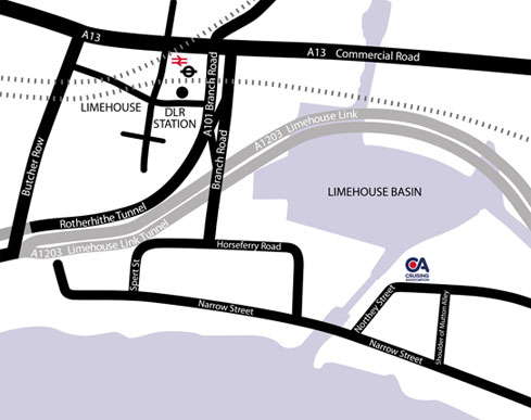 If you are coming by public transport, Limehouse Station on the DLR is the nearest station. You can plan your journey via the Transport for London journey planner. From Limehouse Station take the exit marked ‘Branch Road’. Walk down Branch Road (not down the Rotherhithe Tunnel!). After the first block of flats, turn left through the courtyard. The marina should be ahead of you. Follow the path around the right-hand side of the marina, and continue past the octagonal building (the Lock Office). Cross the Lock and turn left, and CA House is the brown brick building on your right.